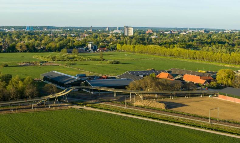 De brug is te gast in het landschap, staat zeker op haar slanke benen en slingert zich behoedzaam tussen de bomen door. De routing van de brug, de slinger over het spoor is enerzijds ingegeven door de toegangen naar de naastgelegen erven te respecteren en een zo efficiënt mogelijke helling te realiseren. Anderzijds is deze ingegeven door het idee een maximale ervaring van het landschap en de plek te realiseren. Door die ene slingerbeweging wordt je je bewust van alle kanten om je heen en beleef je op een nieuwe spannende manier de lange Notenlaan. Een effectieve beweging waarmee er maximaal zicht op het omliggende landschap is en een zo effectief mogelijke verhouding tussen helling en lengte.