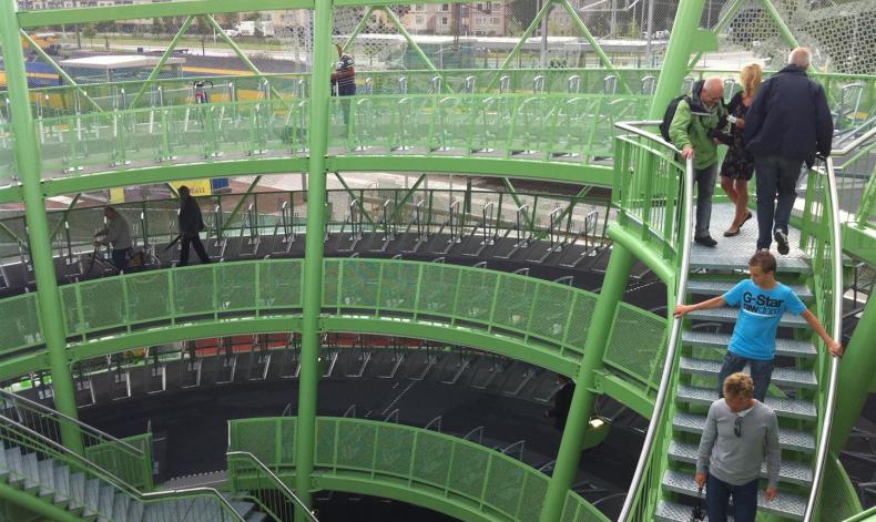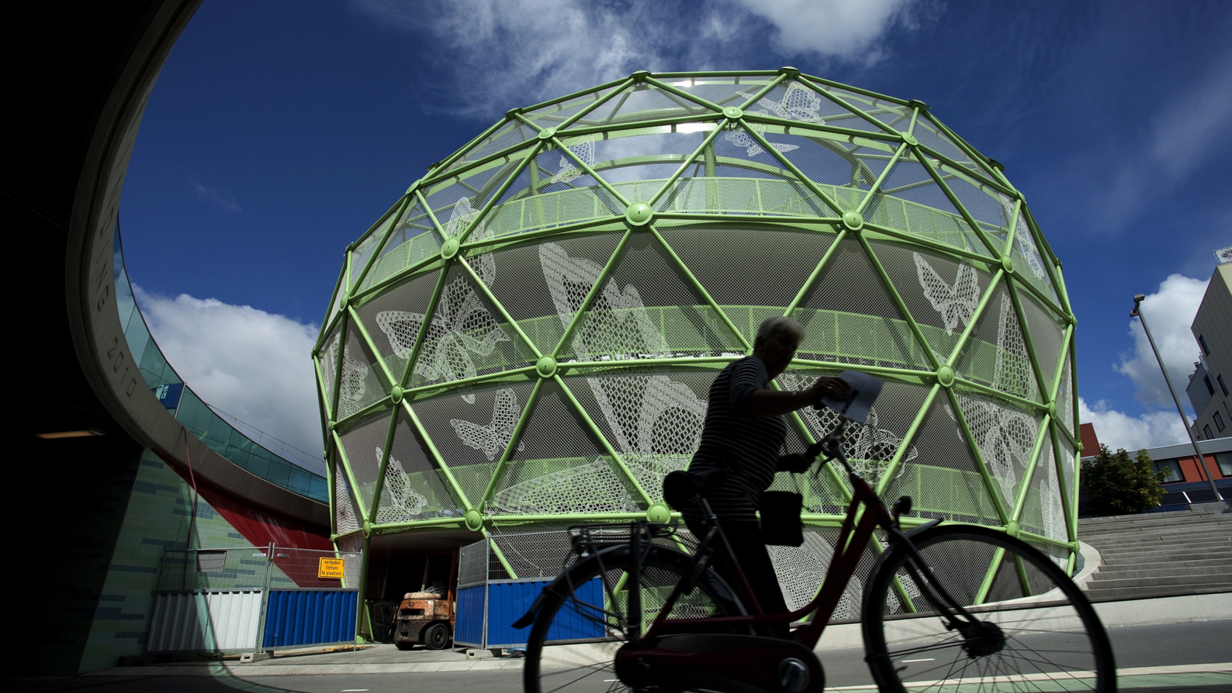 De stalen vloer is opgebouwd uit delen die in de lengterichting via een dwarsverbinding onderling zijn gekoppeld. De vloerdelen liggen op randliggers, zowel ter plaatse van buitenschil als van het 'klokhuis'. De buitenste randliggers zijn verbonden aan de in totaal 105 verschillende zeshoekige knooppunten van het netwerk. Op elke knoop sluiten zes buisprofielen aan, elk onder een andere hoek. De constructie is scharnierend uitgevoerd, behalve de bovenring van het klokhuis en de aansluitingen van de vloerdelen.