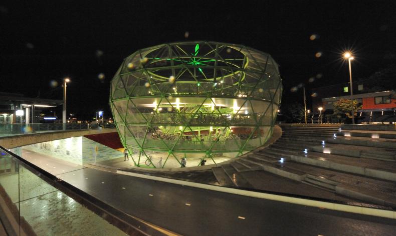 Doordat de hellingbaan van beneden naar boven spiraalvormig verloopt ontstaan vanzelf de contouren van een appel. In het midden staan negen stalen kolommen, het 'klokhuis', dat met een netwerk van staven en knopen aan de buitenzijde van de stalling de hoofddraagconstructie vormt van deze appel van 27,5 m breed en 15,5 m hoog. De hellingbaan gaat 3,5 keer rond. Aan weerszijden van het looppad staan speciale stalen fietsenrekken. In het 'klokhuis' gaan twee stalen trappen tegen de draairichting van de hellingbaan in omhoog, waardoor een spel van verkeersstromen ontstaat.