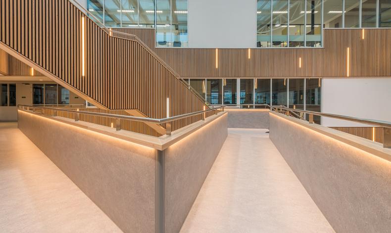 Het voormalige pand van TNO op de TU/e campus Eindhoven is volledig getransformeerd van een voormalig labgebouw naar een flexibel, open en uitnodigend onderwijs- en onderzoeksgebouw. Het ontwerp van EGM architecten geeft het oorspronkelijk sobere, doelmatige gebouw een duidelijk herkenbare en geheel eigen identiteit. De architectonische ingrepen brengen verborgen kwaliteiten aan het licht die de volle potentie van het gebouw laten zien. Meest in het oog springend is het nieuwe atrium in het hart van het gebouw. Dit is een plaats die uitnodigt om elkaar te ontmoeten. Warm en dynamisch. Naast het atrium is de hoofdentree aangepast en een nieuwe automotive-afdeling gerealiseerd. Deze drie gebieden zijn samen het visitekaartje van het onderwijsgebouw.