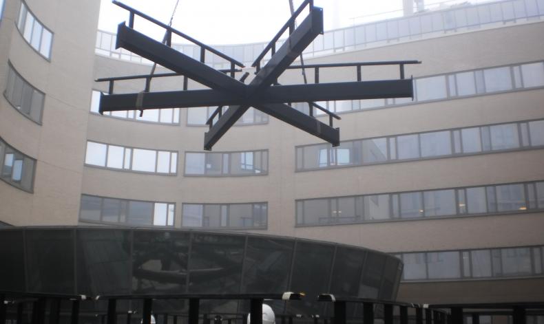 De cirkelvormige, slanke luifelconstructie lijkt van onder gezien 4,5 m boven de grond te zweven, maar hangt aan de gevels van de belendende kantoorgebouwen. Het glazen dak in het midden en een ingebouwde led-verlichting in de stalen liggers zorgen voor voldoende licht onder de luifel.