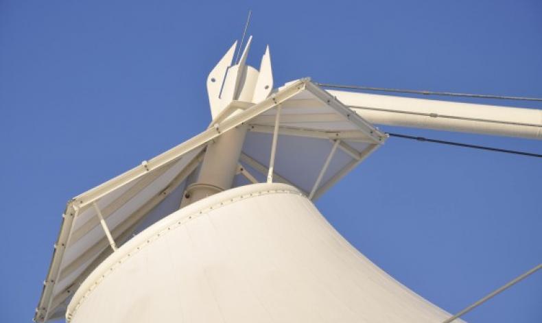 Stalen ringen (kraaiennesten) met een diameter van 4 m verbinden het doek aan de staalconstructie. De 25 m hoge pylonen met een diameter van 500 mm zijn verankerd aan een dynamische fundering door een scharnierende verbinding met de voetplaat. De bovenzijden van de hoofdpylonen zijn voorzien van polycarbonaten lichtkappen om inregenen te voorkomen.