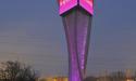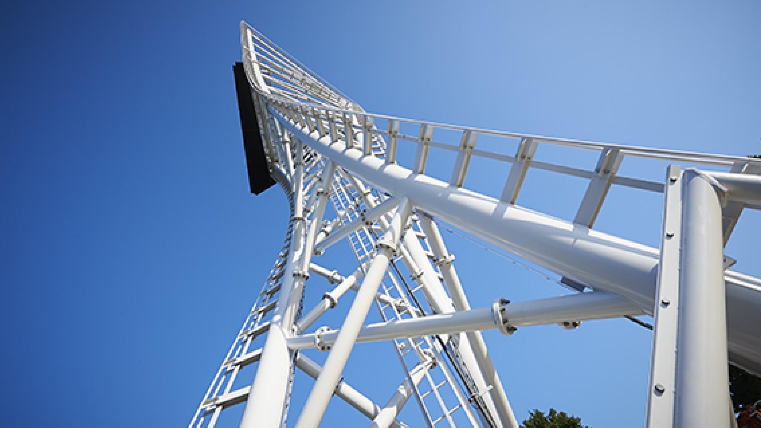 Door het torderen van de mastdoorsnede en het toepassen van diagonalen in twee richtingen trekt de ene helft van de diagonalen naar binnen, waardoor de vrije interne ruimte wordt beperkt. En daar moest de onderhoudstrap ingepast worden, die nodig is vanwege de ledschermen in de top.