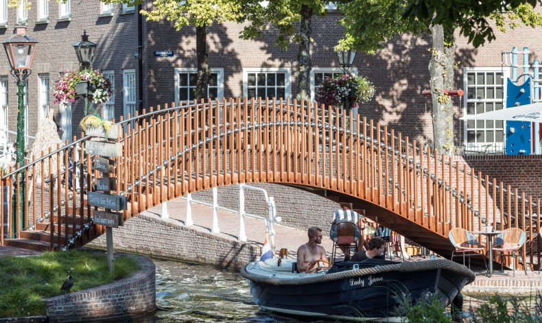 De hulp van een staande boog kan bestaan uit het toevoegen van stijfheid, zoals bij gangbare boogbruggen, of bij extra slappe constructies met een lateraal stabilisatiesysteem, zoals een beugel. Voor het laatste is gekozen. De bollen worden gestabiliseerd door een reeks U-vormige dwarsbeugels. De verticale armen van de U brengen de krachten over van het dek naar de bollen, wat zorgt voor de dwarsstabiliteit. Tegelijkertijd vormen de stijlen de reling. De U-vormige dwarsbeugels zijn gemaakt van weervast staal. Het ‘roestig’ uiterlijk contrasteert sterk met het rvs.