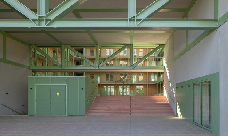 Architectonisch en doelmatig .Het staal in de gevel is niet enkel esthetisch, maar ook waarachtig en functioneel. De stalen elementen zijn zo ontworpen dat ze de balkons, galerij en bovenliggende woningen ook echt dragen. Zo zorgt het vakwerk er voor dat de herhalende plattegrondstructuur met molenwiekplattegrond en gelijke woningtypes door kon lopen en draagt de staalconstructie ook echt de balkons en galerijen, waardoor isokorven en aanstortingen voorkomen konden worden. De elementen zijn allemaal droog opgelegd en doormiddel van verborgen boutverbindingen aan elkaar gekoppeld, waardoor de volledige constructie demontabel is uitgevoerd.