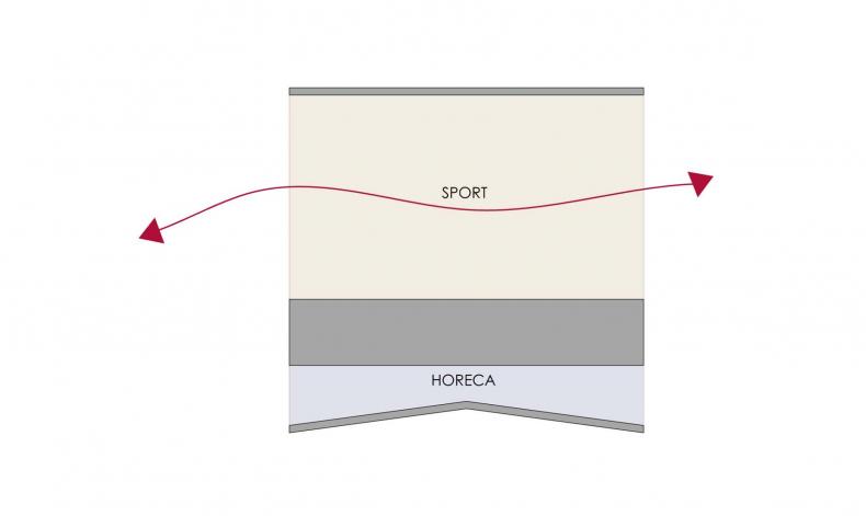 Het gebouw is ruimtelijk onderverdeeld in twee bouwdelen: de wedstrijdruimte naar het noorden georiënteerd voor een egale daglichttoetreding en het hiernaast gelegen deel met kleedkamers en horeca. Waar de bouwdelen elkaar overlappen bevindt zich de ruggegraat van het gebouw met de circulatie, constructie en installaties. De multifunctionaliteit nu en naar de toekomst tussen sport, school en buurt stond centraal bij de functioneel ruimtelijke indeling. De keuken van het sportcafé kan worden gebruikt door de praktijkscholen als opleidingscentrum, de bestuurskamer voor de sportverenigingen is een vergader- en cursusruimte voor de buurt.