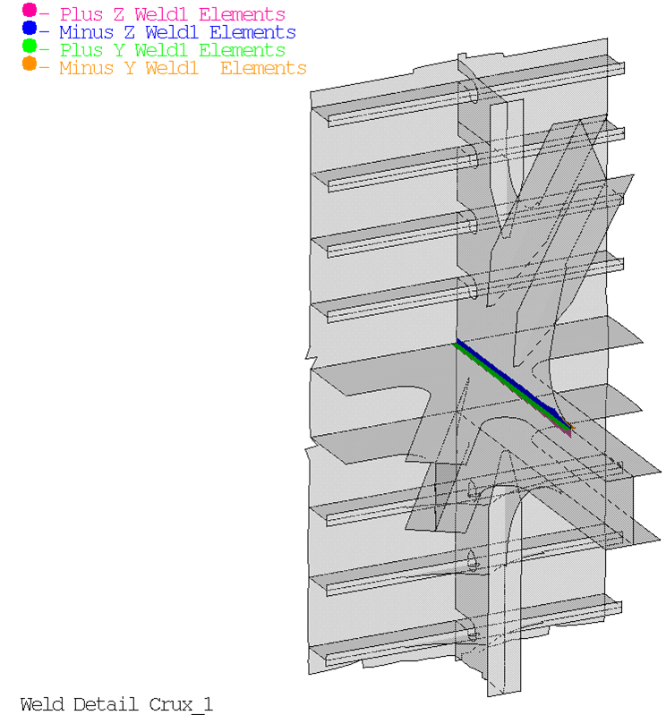 Hiertoe werden in eerste instantie de belastingen vastgesteld, waarbij gebruik werd gemaakt van gedetailleerde FEA-modellen die in FEMAP en/of ANSYS waren gemaakt. Om het aantal FEA-runs te beperken, waren de 400 knopen per deur onderverdeeld in 50 blokken met een vergelijkbare geometrie en belastingsomstandigheden. Elk van deze 50 unieke knopen werd vervolgens in detail gemodelleerd en geïntegreerd in het bestaande – ruwere – globale model van de deur. Hiermee werd de juiste interactie van de knoop en de rest van de deur in stand gehouden. Vervolgens werden diverse exemplaren van het globale model gemaakt, elk met een beperkt aantal gedetailleerde knoopmodellen. Op deze wijze werd de beschikbare computercapaciteit optimaal benut. Hierna volgde het meest tijdrovende onderdeel van het proces. Alle lassen en andere vermoeiingsgevoelige elementen moesten in een bepaalde vermoeiingsklasse worden ingedeeld. Op basis van de berekende belastingen werden de specifieke belastingen van de lassen vastgesteld, waarna werd nagegaan of de toelaatbare belasting voor het betreffende vermoeiingsdetail aan de hand van de van toepassing zijnde code niet werd overschreden. Met gemiddeld 100 te controleren lassen per knoop, 50 unieke knopen per deur en zes verschillende deurtypen moesten er in totaal maar liefst 30.000 lassen worden gecontroleerd. Om dit repetitieve proces te versnellen en fouten te voorkomen, werden diverse processtappen geautomatiseerd. Er werd een programma geschreven om de verbindingen tussen de verschillende platen in het FEA-model automatisch te herkennen. Dit programma zette de resultaten vervolgens om in speciale spreadsheets, waarin ook de verschillende belastingscomponenten, gegevens over het soort verbinding (kruis, T of haaks) en een afbeelding van de verbinding waren opgenomen. Nadat daar nog de omvang van de las, het soort las en de vermoeiiingsklasse van elk van de lassen aan waren toegevoegd, kon met de spreadsheets de verwachte cumulatieve schade (vermoeiing) aan het eind van de ontwerplevensduur worden vastgesteld.