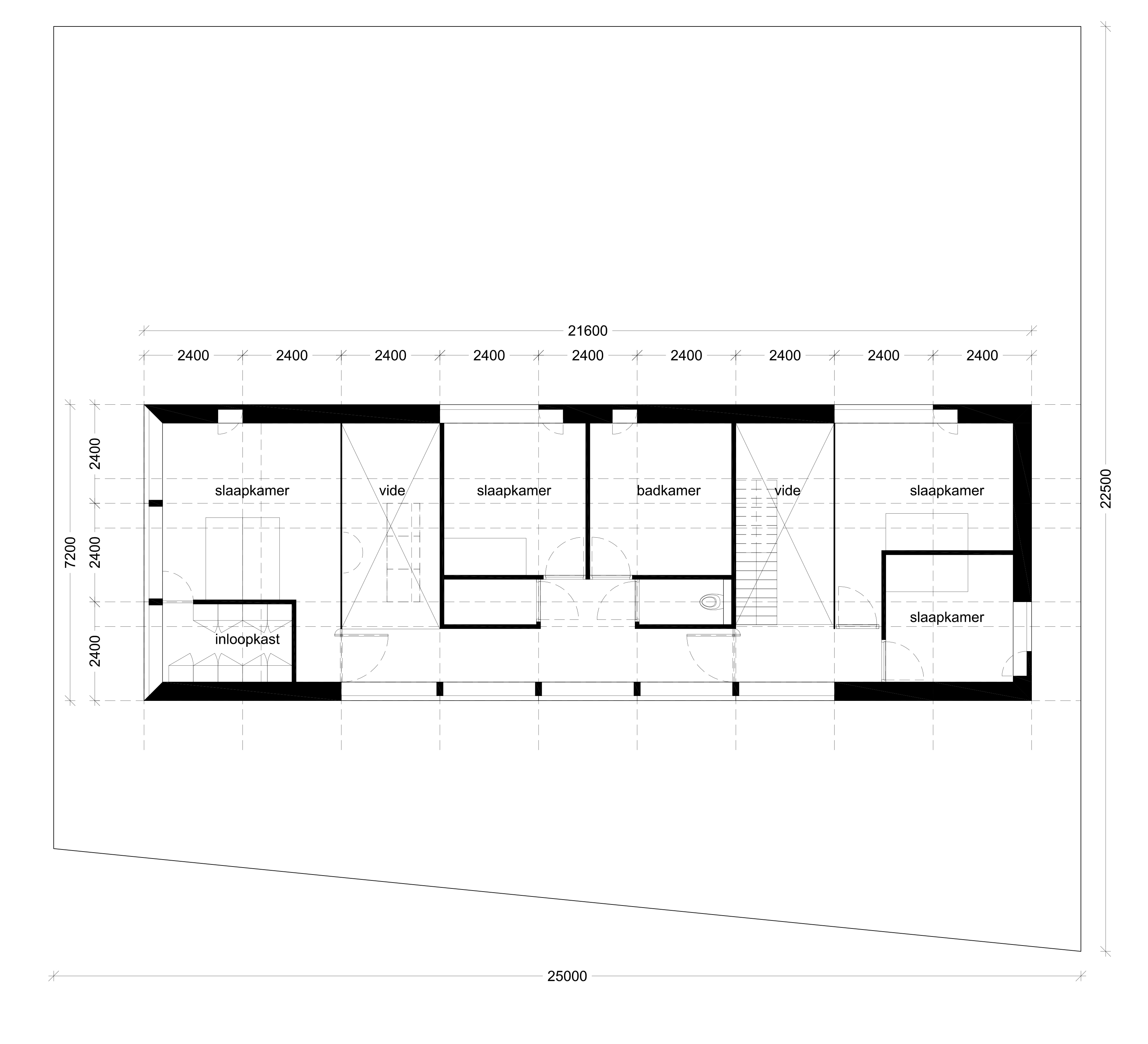 'Het leuke daarvan is wel dat het stramien zo direct afleesbaar is, het staat als het ware op de gevel uitgetekend.' Wanden, raamindeling, alles aan de woning staat strak in dat stramien. Niet alleen handig in de uitvoering, werken met standaard maten , 'maar het gaat ons ook om het ritme. Dat geeft geeft visueel rust en vestigt de aandacht op de afwijkende elementen', verklaart Lautenbag. 'Dat doen we in al onze ontwerpen. Het is tegelijk ook een spel met symmetrie; afwijkingen moeten visueel spannend en in balans zijn.'