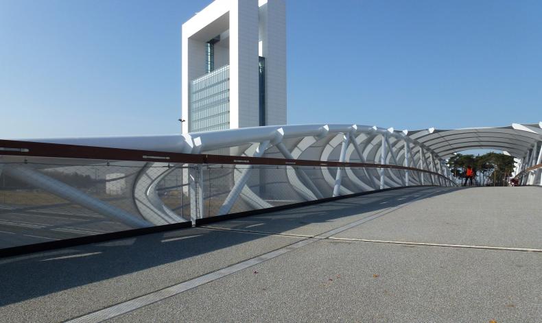 De staalconstructie van de hoofdoverspanning bestaat uit twee langsspanten, opgebouwd uit twee ronde buizen met een diameter van 360 mm, met een totaal gewicht van150 ton. De wanddikte varieert van 10 tot 40 mm. Tussen de onderbuis en bovenbuis lopen diagonalen. Naar het midden van de brug toe 'groeit' de constructiehoogte van de spanten tot een hoogte van 4,5 m. De langsspanten zijn 10˚ gekanteld. Dwars op de beide langsspanten bevinden zich ovalen, die onder het brugdek doorlopen en de beide spanten koppelen. Elke ovaal heeft een andere vorm en in het midden lopen de ovalen zelfs over de brug door als koppeling aan de bovenzijde. Dit principe is doorgezet in de aanbruggen, waarbij de spanten in een bocht lopen en op het einde taps toelopen.